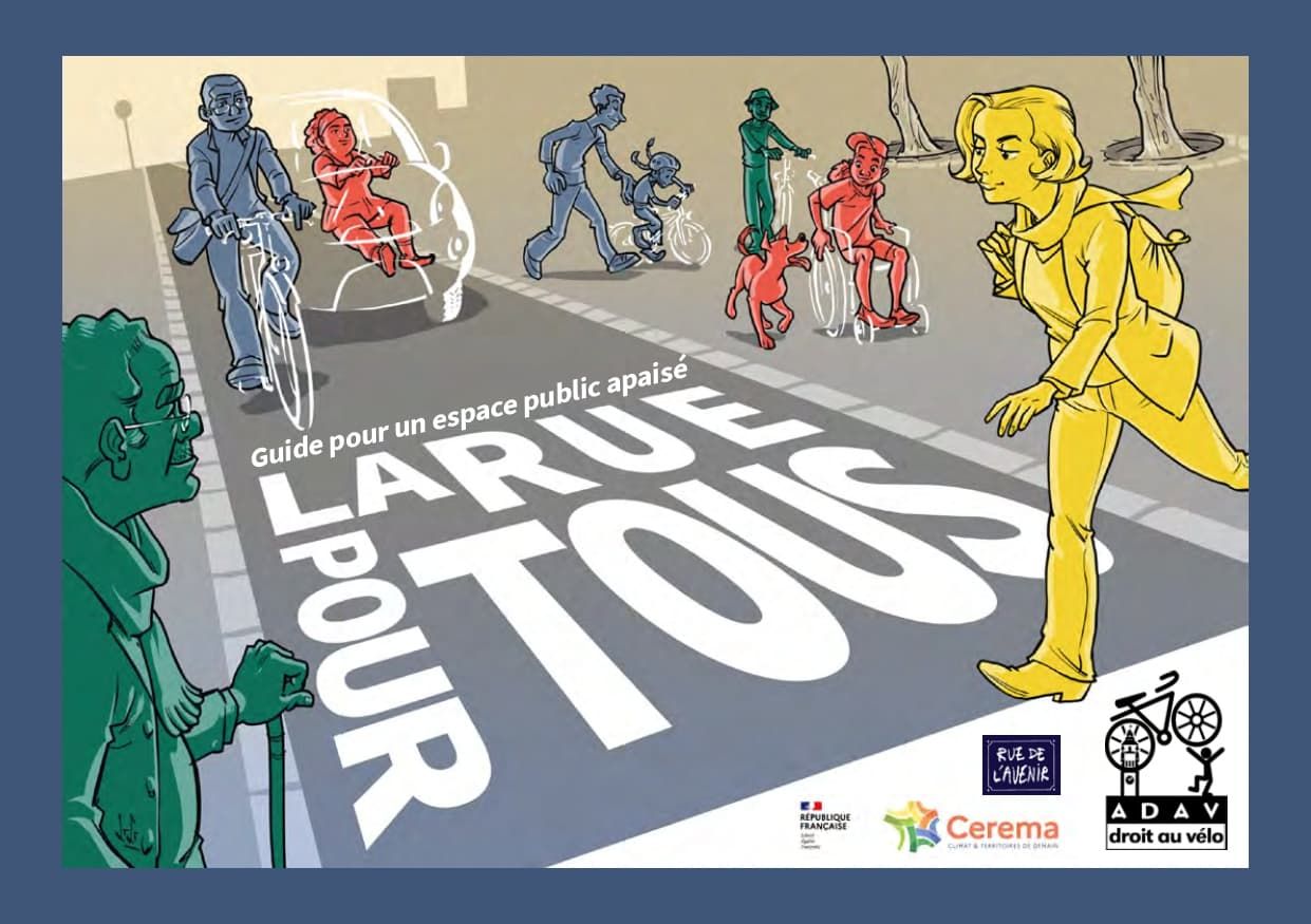 Réalisé par l’Association Droit au Vélo (ADAV), le document « La rue pour tous, guide pour un espace public apaisé » a été coconstruit avec le Cerema et l’association Rue de l’Avenir dans le but de faire connaître la réglementation actuelle relative aux modes actifs, ses évolutions, et d’expliquer l’intérêt des différents types d’aménagements et mesures en faveur de ceux-ci : fonctionnement des zones de circulation apaisées, intérêt des plans de circulation et des mesures de réductions des vitesses, comportements à adopter et règles à respecter pour chaque usager·ère.